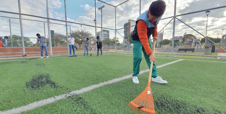 Durante la jornada de este viernes, un equipo multidisciplinario llegó hasta el barrio Villa Brígida, Distrito 1, para realizar el mantenimiento de la cancha de pasto sintético de la zona con el material de caucho granulado y distribuido en todo el espacio para que se mantenga de manera adecuada y los vecinos puedan hacer uso de las mismas para actividades deportivas.