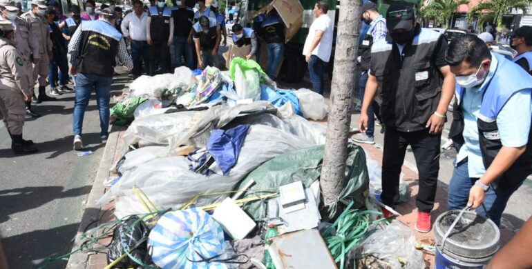 Mientras el personal municipal procedía a levantar los residuos amontonados, Denar Sumoya, subalcalde del Distrito 1, expresó su molestia, señalando que no es posible que un espacio que debe servir para la circulación de la ciudadanía, se haya convertido en un microbasural en pleno centro de la ciudad y que, además, esté tapado con carpas, las mismas que al ser levantadas despedían olores nauseabundos.
